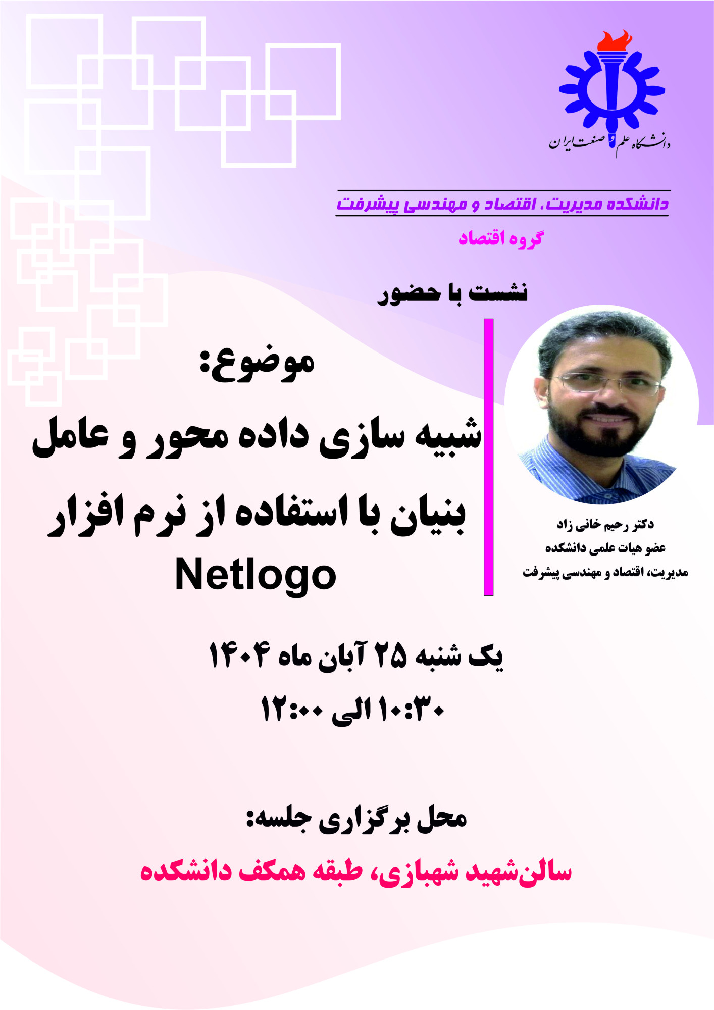 جلسه هفتم: ۹ آذر – دکتر خانیزاد: شبیهسازی دادهمحور و عاملبنیان با استفاده از نرمافزار NetLogo